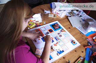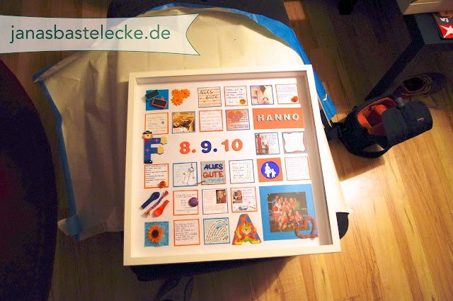 Der Rahmen war ein RIBBA Rahmen von IKEA, natürlich quadratisch. Zusätzlich hab ich alle möglichen Dinge zusammen gesucht oder gekauft, die blau und orange waren um den Rest zu dekorieren, der nicht von Quadraten belegt war.