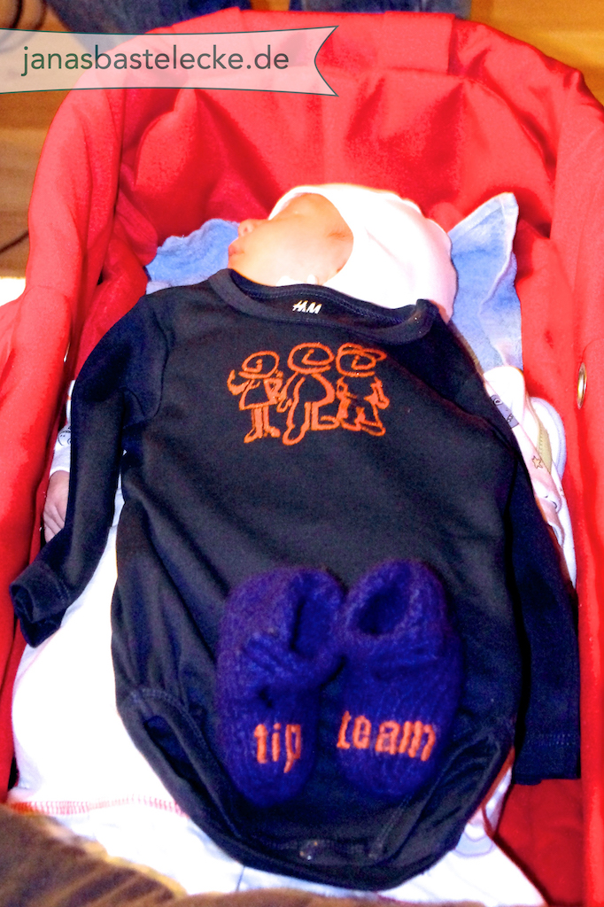 Es gab auch noch passende Kleidung für den Kleinen, so dass er gleich beim Freiwilligenteam einsteigen konnte. Dafür hatte ich einen dunkelblauen Body gekauft und mit orangener Stoffmalfarbe das Logo des Teams draufgemalt. Meine Mutter hatte ich beauftrag Babyschuhe zu Stricken und Filzen und ich bin mir nicht mehr sicher, wer von uns beiden dann den Schriftzug trockengefilzt hat.