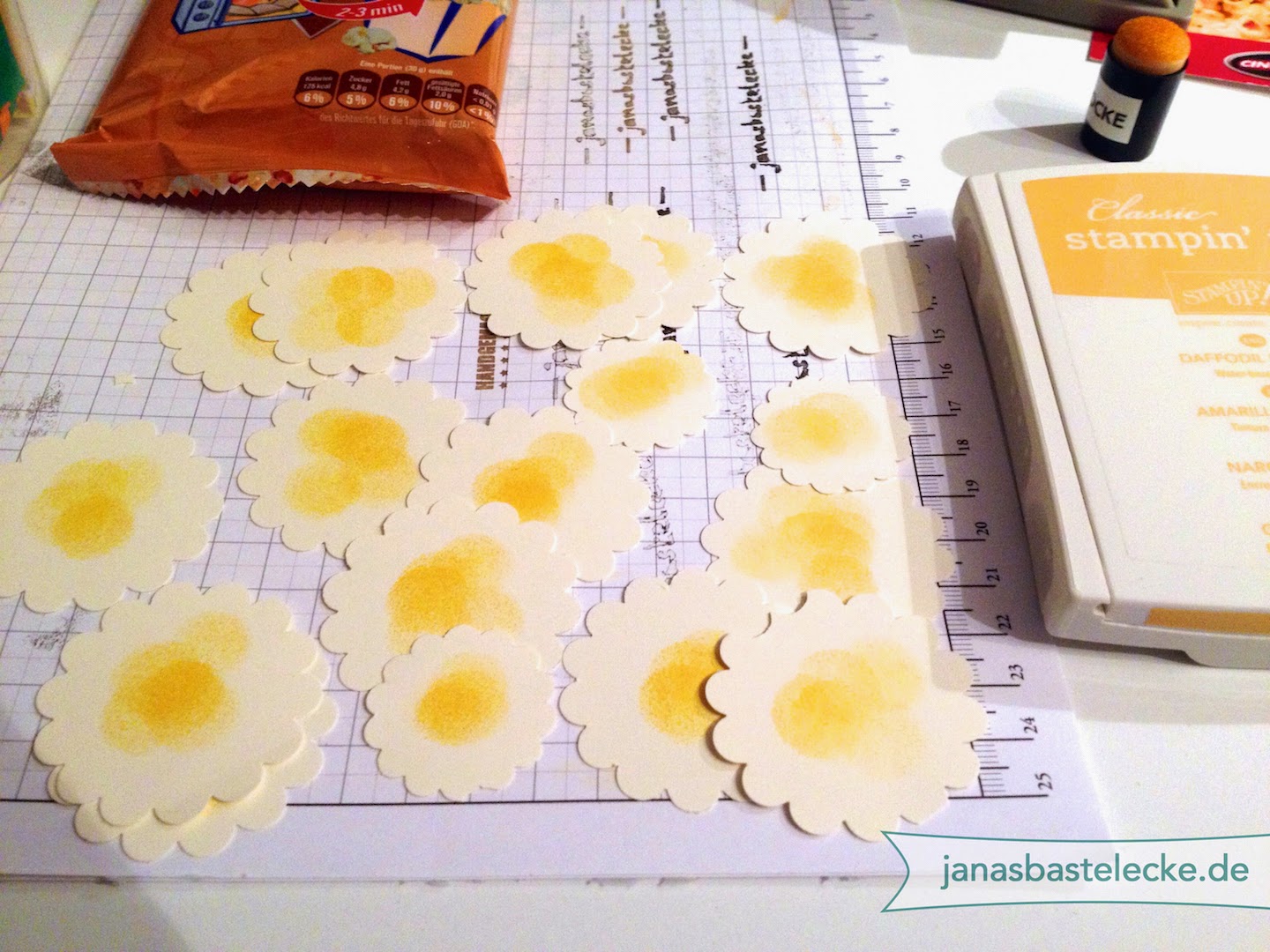 Als nächstes habe ich mit den Wellenkreisstanzen einige Stanzteile in Vanille Pur ausgestanzt und nur in die Mitte mit dem Fingerschwämmchen gelebt Farbe getupft. Das reicht auch auf einer Seite. Wenn man sich Popcorn genau anguckt, dann sind die in der Mitte immer etwas dunkler.