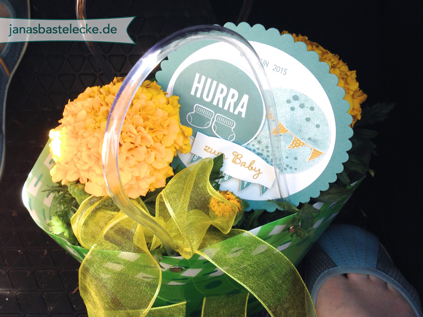 Aber jetzt erstmal zum Ersatzgeschenk. Mein Freund und ich waren vor dem Krankenhausbesuch schnell beim Blumenladen und haben ein gelbe Pflanze besorgt. Das war wichtig, damit die Karte, die ich als Deko gebastelt habe auch dazu passt.
