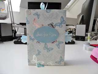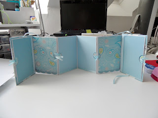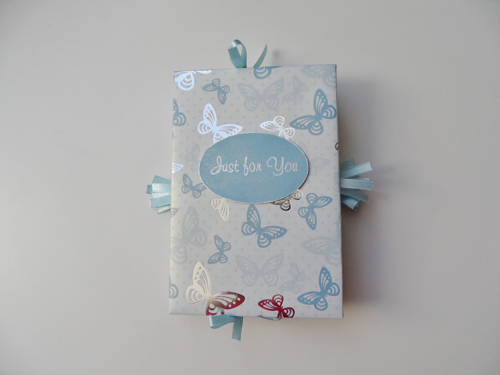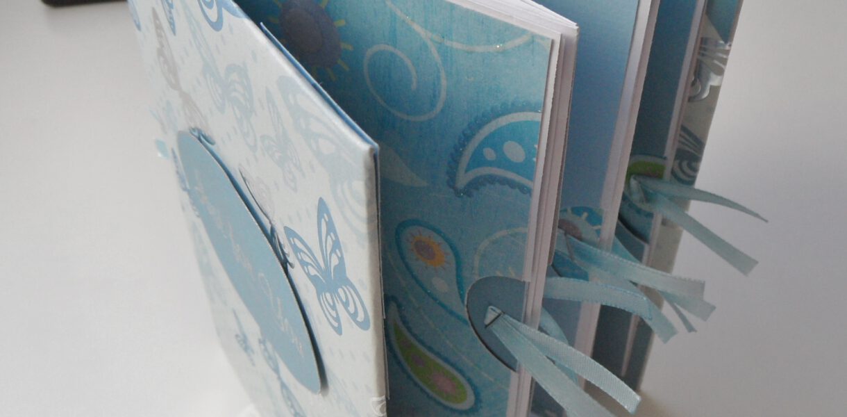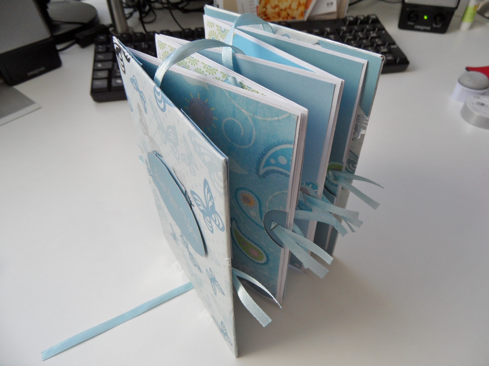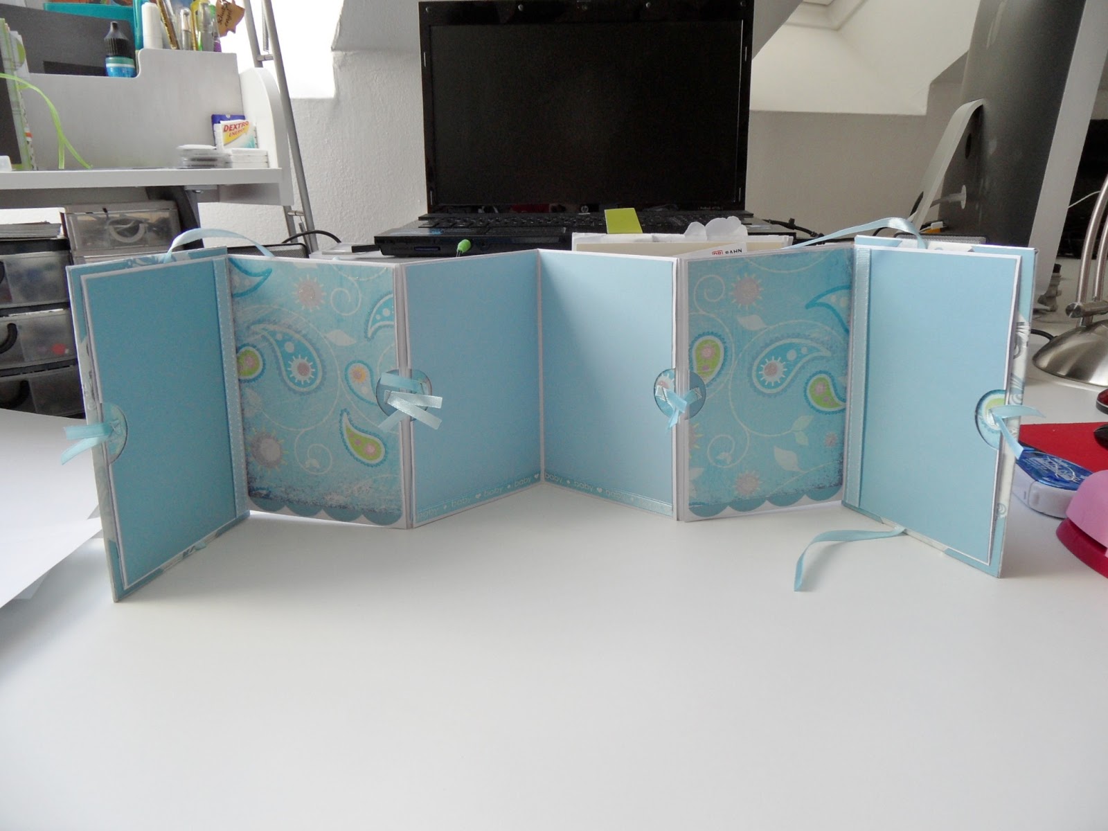 Dieses Mini-Fotoalbum hatte ich für die Mutter des Freundes meiner besten Freundin gemacht. Sie lebt in den USA und hat ihren Enkel noch nicht gesehen. Im Video seht ihr das Album im Rohzustand, da hab ich dann noch die Babyfotos eingeklebt. Bei anderen Projekten sind die Fotos schon mit drin, weil ich oft die Ideen für die Gestaltung der Seiten erst bekommen, wenn ich weiß, welche Fotos ich dort einklebe.