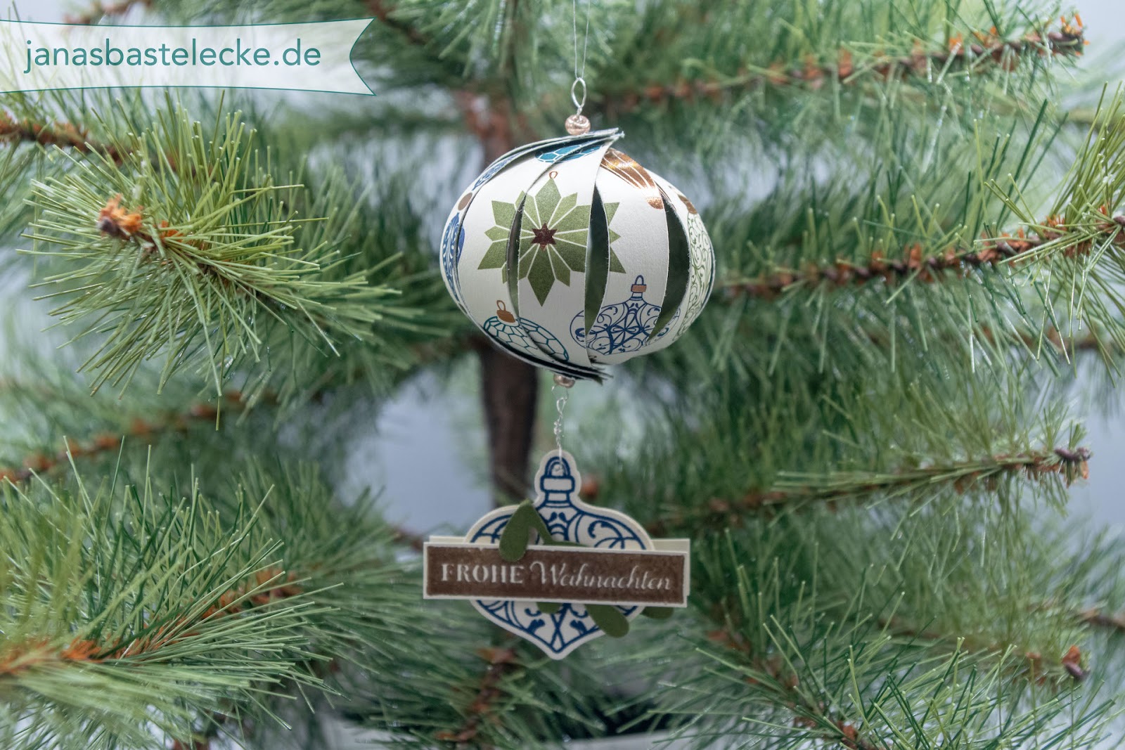 Der obere Teil des Doppelornaments ist aus Papierstreifen eines Designerpapiers gemacht. Beim unteren habe ich das Stempelset „Festtagsglanz“ und die passende Stanze, aus dem Stanzpaket „Christbaumzierde“, verwendet. Auch das „Frohe Weihnachten“ ist aus dem Stempelset. Ich habe es in Kupfer embossed und dann mit der Schere ausgeschnitten. Ihr findet Stempelset und Stanzen im Herbst-/Winterkatalog auf den Seiten 30 bis 32.