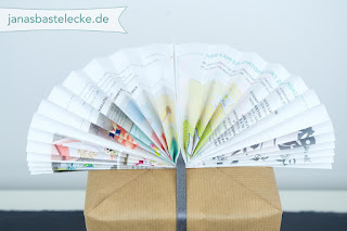 Ich habe bei der Sale-A-Bration Broschüre die Tackernadeln entfernt und mir eine Doppelseite geschnappt. Die hab ich dann beim eh schon vorhandenen Falz zusammen gefaltet und hab sie mit der Falzklinge vom Schneidebrett bei je 1 cm gefalzt bis zum Ende. Daraus lässt sich dann ein toller Fächer kreieren, den ich in der Mitte mit Klebepunkten festgeklebt habe, damit er auch aufgestellt bleibt.