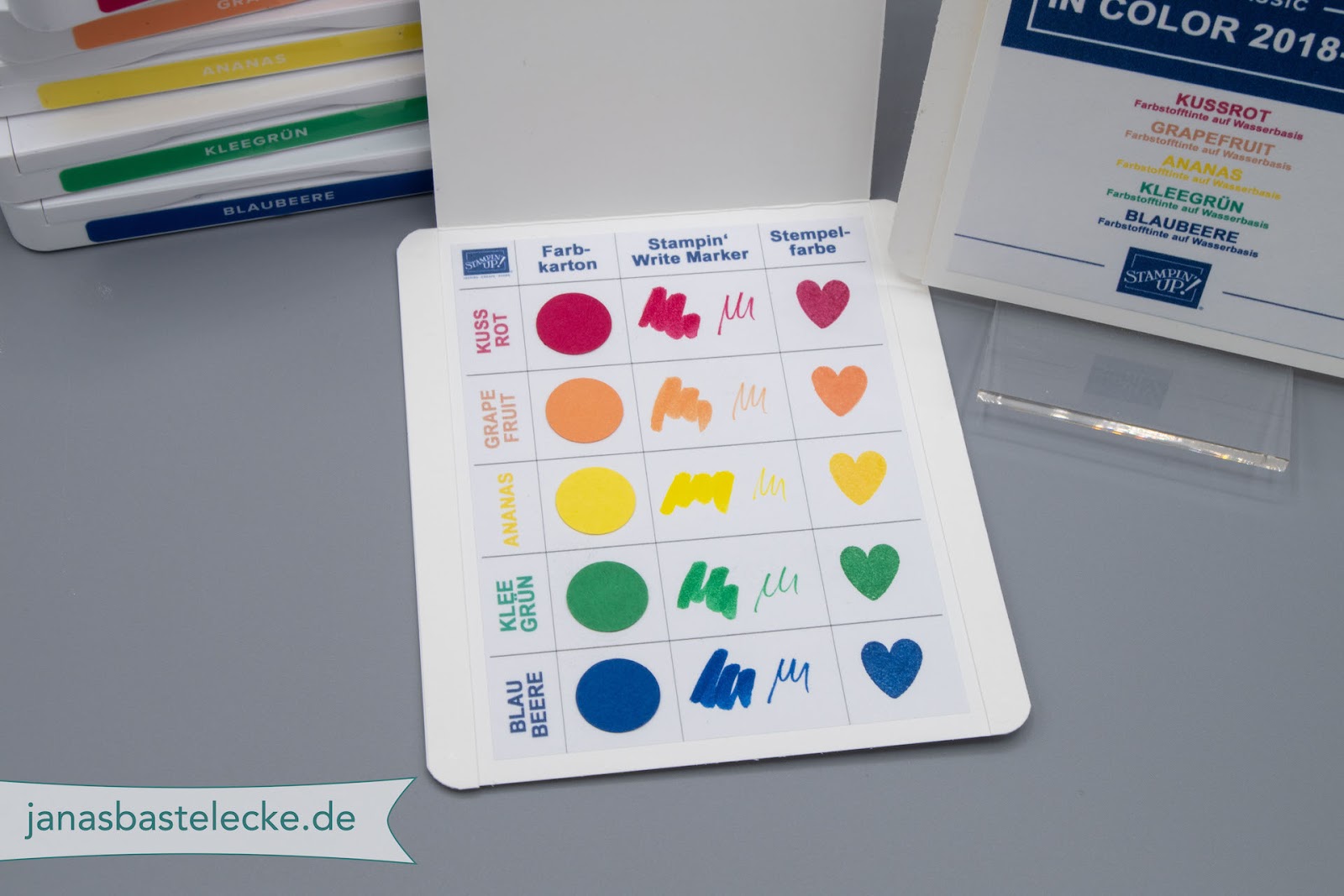 Und das war mein Swap den ich dafür eingetauscht habe. Er ist eher was für Demonstrator*innen die auch über Stampin‘ Up! verkaufen, deshalb hab ich dazu keine Anleitung gemacht. Die Demos, die mit mir getauscht haben, können mir eine Mail schicken und dann bekommen sie von mir die Druckvorlagen für die Vorher- und Innenseite mit den In Color 2018-2020 die jetzt noch gültig sind und den neuen In Color 2019 – 2021, die im neuen Jahreskatalog mit drin sind.