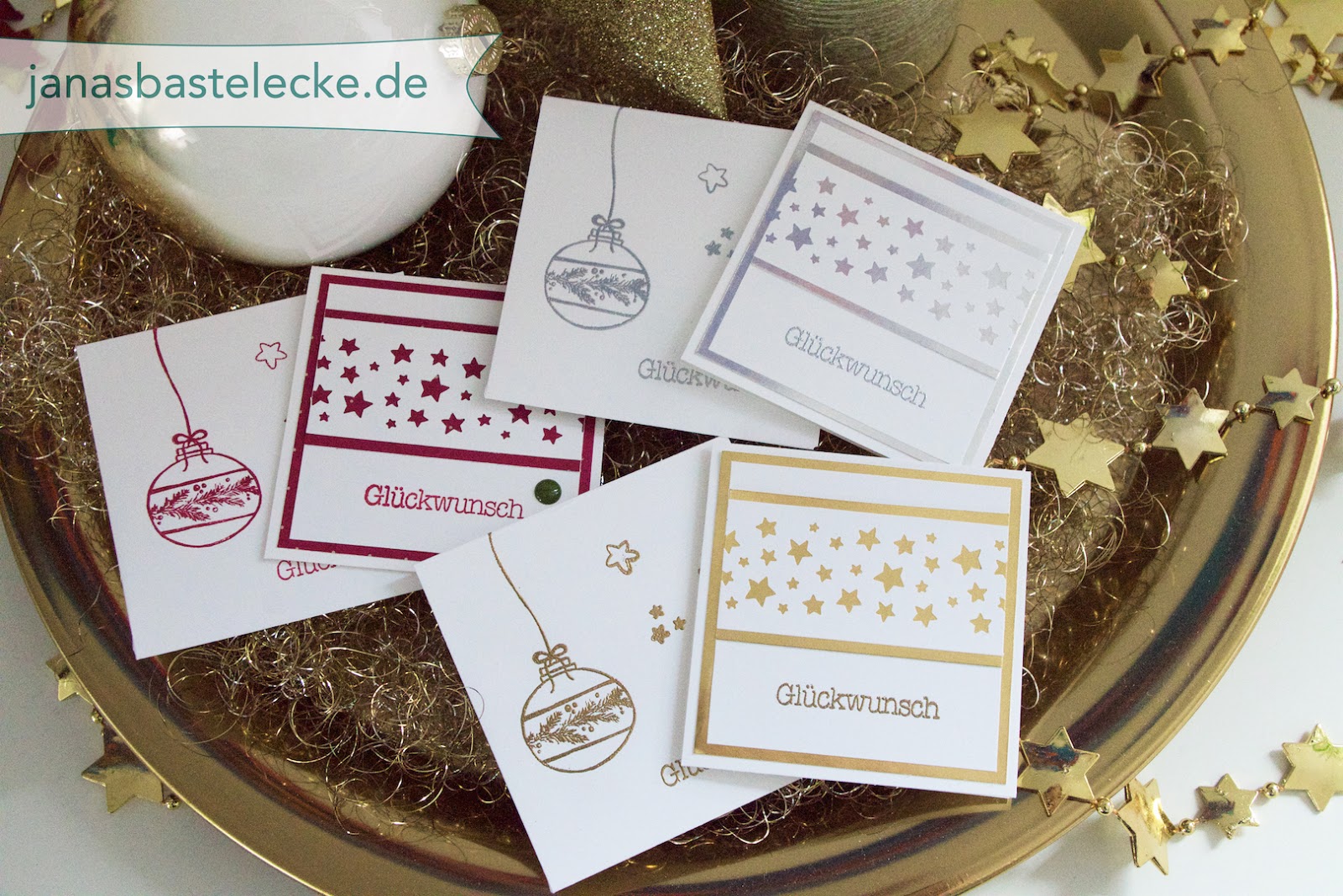 Als ich den Gewinnern von meiner Verlosung „12 Tage Weihnachten 2015“ ihre Gewinnpakete geschickt habe, hab ich natürlich auch farblich passende Kärtchen dazu gemacht. Dafür hab ich de kleinen quadratischen Umschläge von Stampin‘ Up! verwendet und einfach passende Kärtchen geschnitten und gefalzt. Für die silberne und goldene Karte hab ich die metallische Folie genommen und für die rot einfach Farbkarton in Chili. Vom Prinzip her ist das die Karte aus meinem Video „12 Tage Weihnachten – Einfaches Grußkärtchen“. Ich hab nur die Maße angepasst und die Umschläge noch etwas mehr mit Embossing verziert.