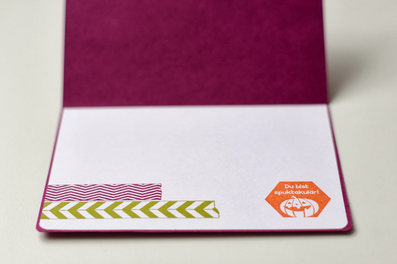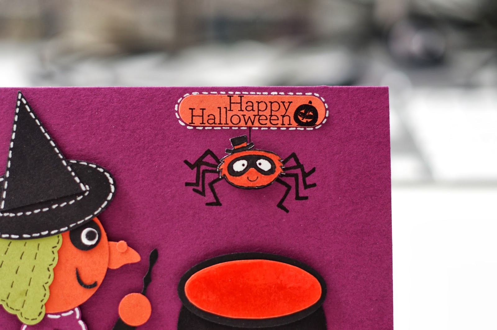 Die Spinne habe ich sowohl auf die Karte wie auch auf ein weißes Papier gestempelt, den Körper extra ausgeschnitten und bemalt und dann mit Abstandshaltern aufgeklebt.