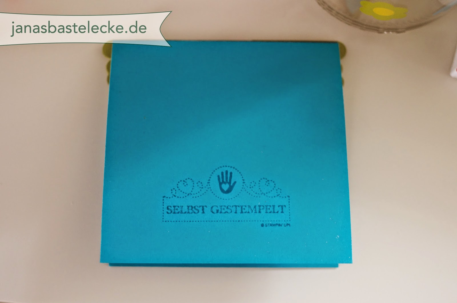 Und damit auch erkenntlich ist, dass die Karte zum Einen selbstgemacht ist und zum Anderen von „Stampin‘ Up!“ habe ich auf die Rückseite noch einen Stempel aus dem Stempelset „Kreativ & selbst gemacht“ gestempelt. Natürlich Ton in Ton, denn der Stempel soll ja nicht zu sehr heraus stechen.