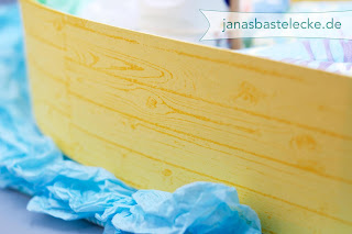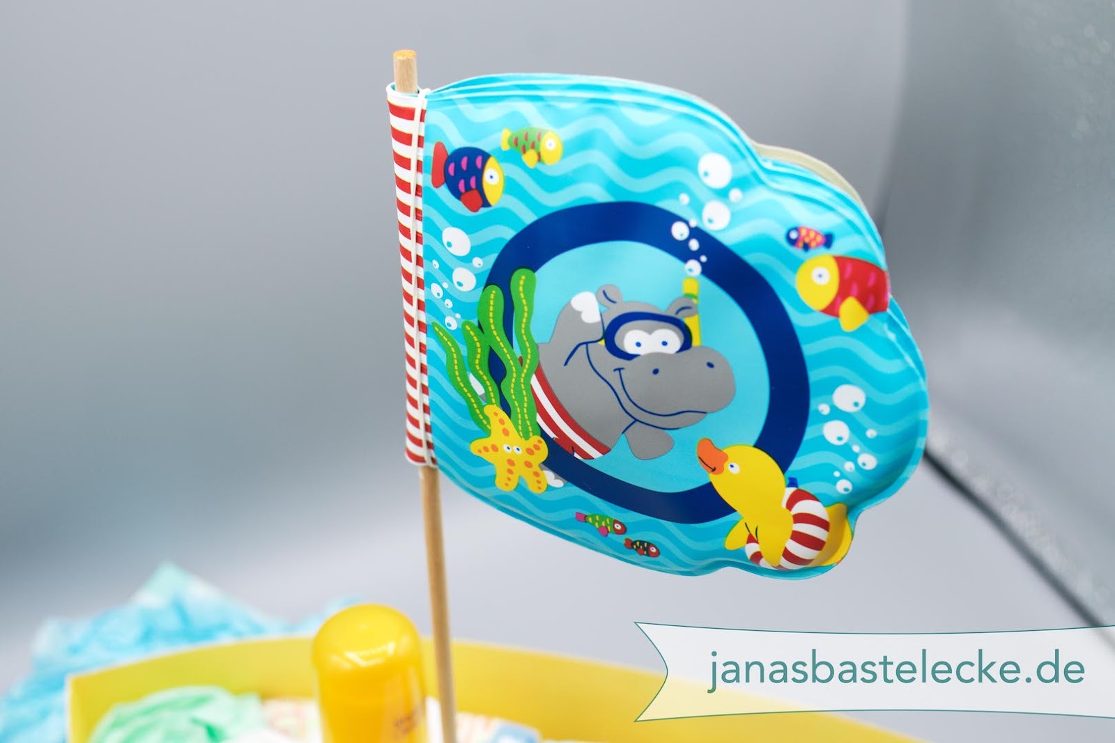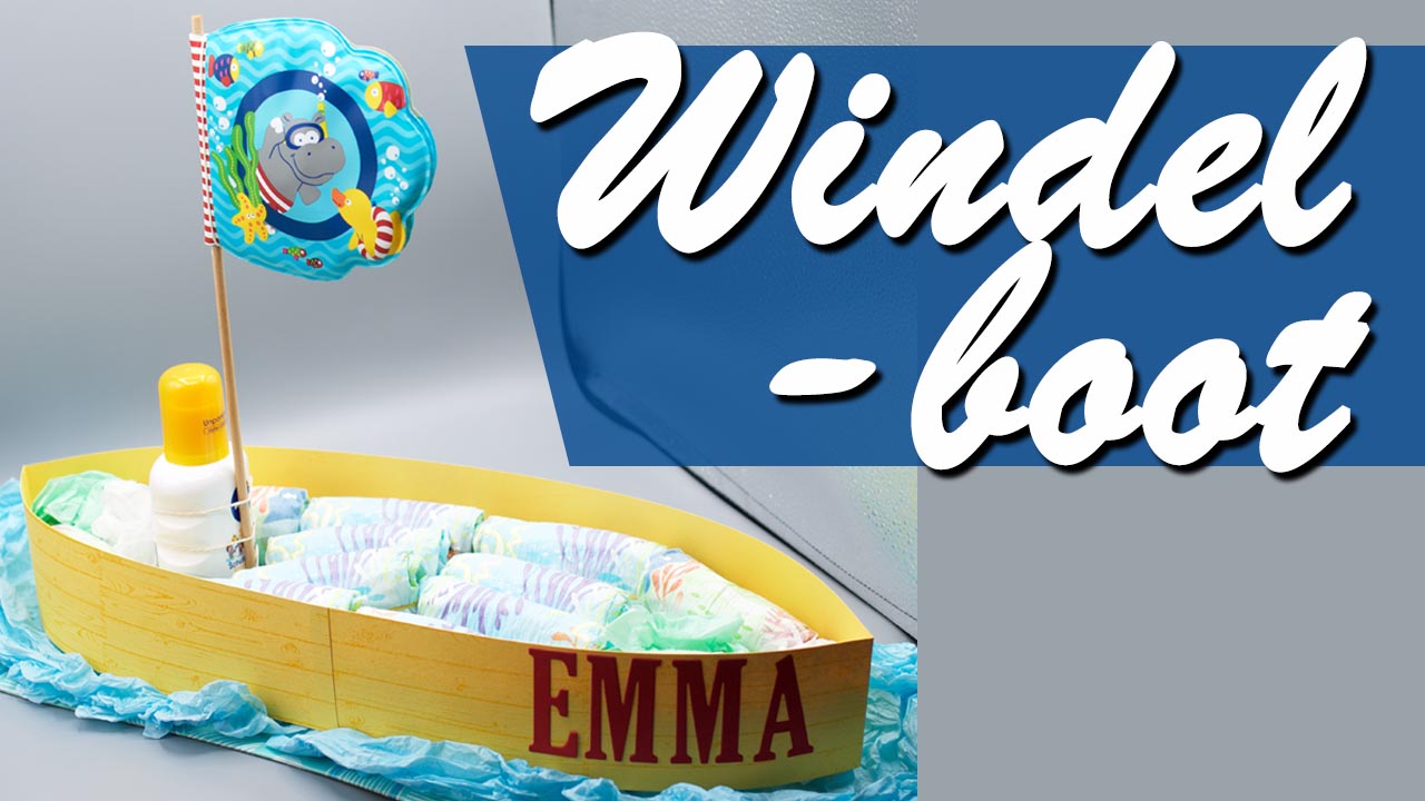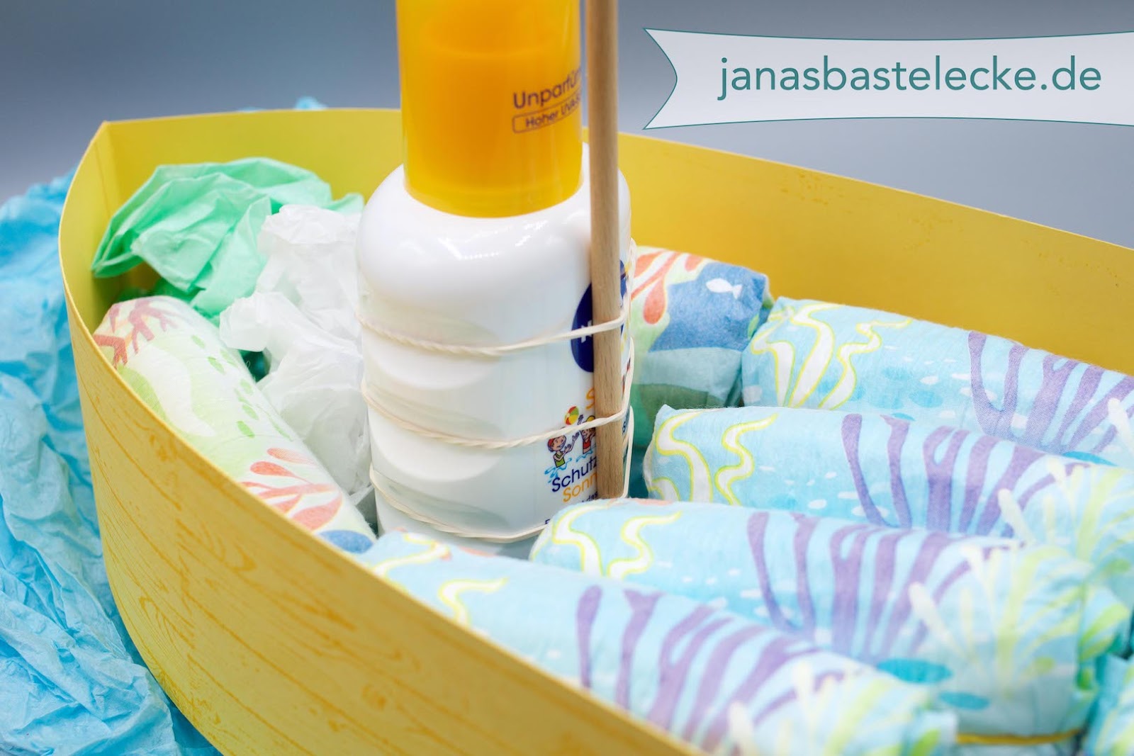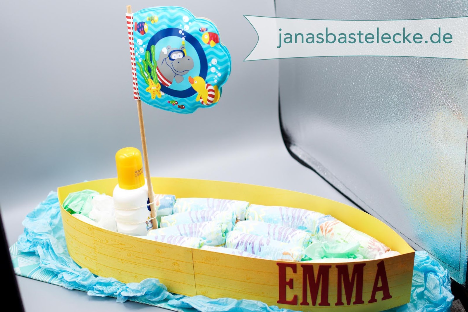 Anstelle der üblichen Windeltorte zum Baby habe ich ein Windelboot gemacht und das mit Schwimmwindeln, einem Badebuch und Sonnencreme. Boote haben ja immer Namen und so konnte ich auch gleich den Namen des Babys mit einbauen.