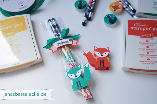 Beim Einkaufen im Kaufland habe ich Schulsachen mit Füchsen und Eulen drauf gefunden und nachdem ich die neue Fuchsstanze von Stampin‘ Up! noch nicht ausprobiert hatte, hab ich mich entschieden etwas mit Füchsen drauf zu nehmen.
