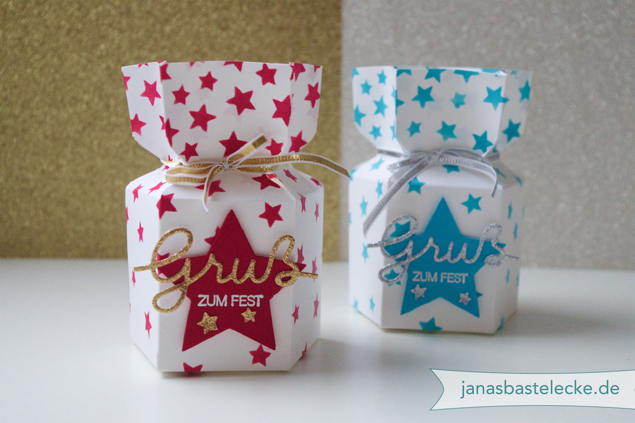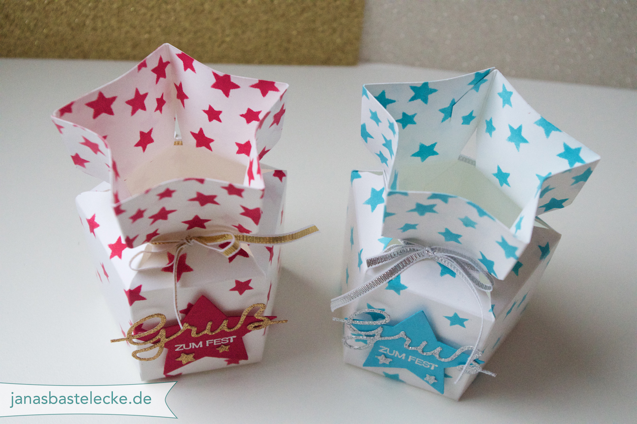 Sie hatte die Box als eins der Make-and-Take-Projekte auf ihrer letzten Stempelparty gemacht. Das sind Projekte, die die Teilnehmer selber basteln und dann mit nachhause nehmen können. Es gab auch die Möglichkeit die Box in Türkis und Silber zu machen, auch sehr schön.