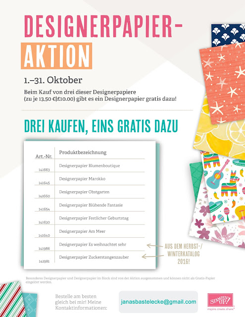 Heute kommt nur eine kurze Erinnerung, dass ihr noch bis zum 31.10. beim Kauf von drei Designerpapieren eins gratis dazu bekommt. Für welche Papiere das gilt seht ihr unten auf dem Bild. Wenn ihr draufklickt müsste er größer werden.