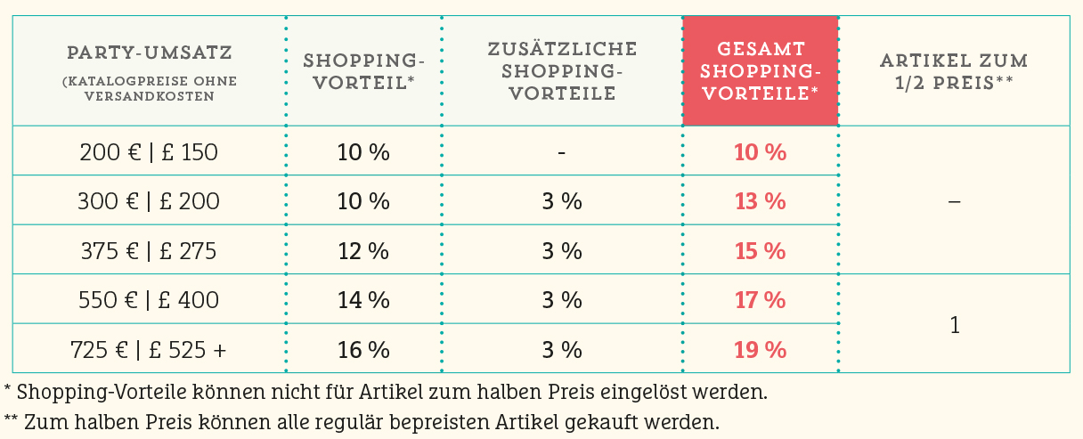 Wenn ihr bei eurer Bestellung, egal ob Einzelbestellung oder Kreativparty-Bestellung, über 300€ liegt bekommt ihr 3% mehr Shopping-Vorteile. In der Tabelle seht ihr, was das bedeutet.