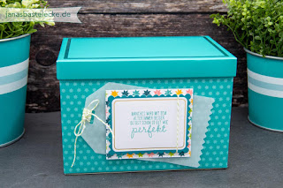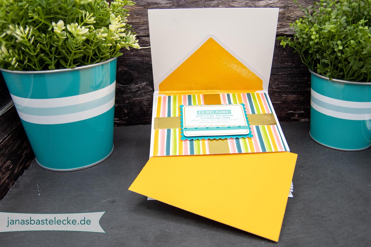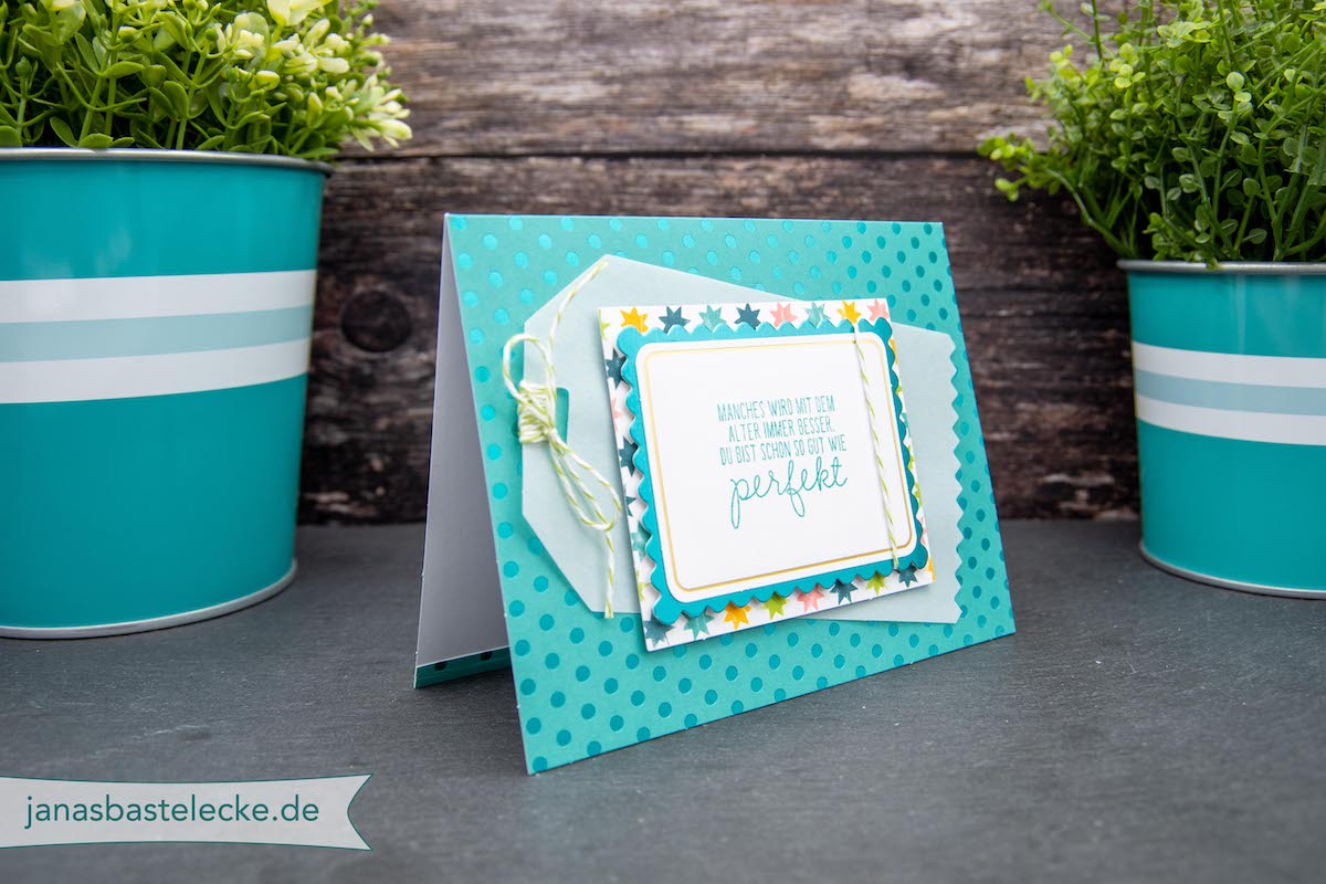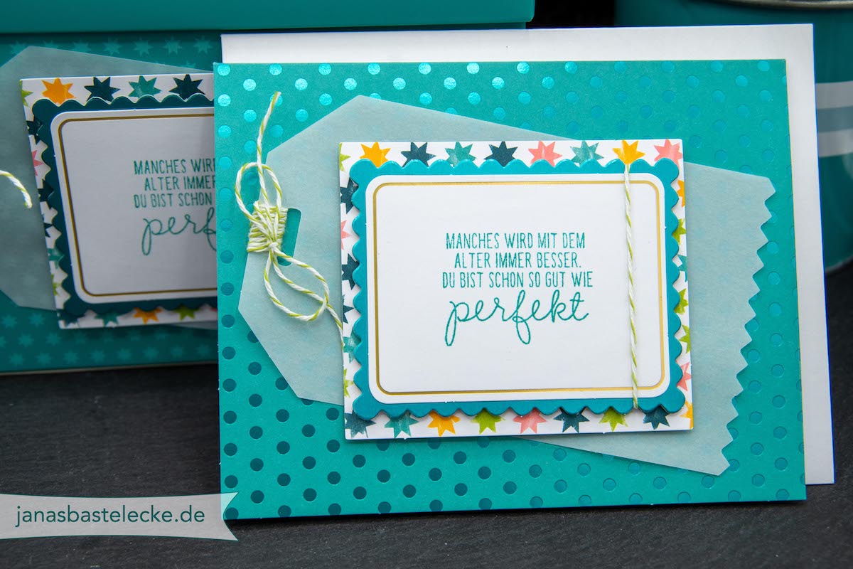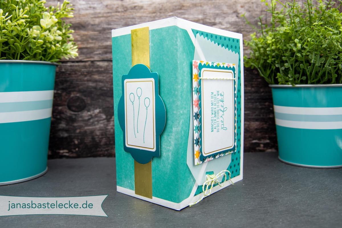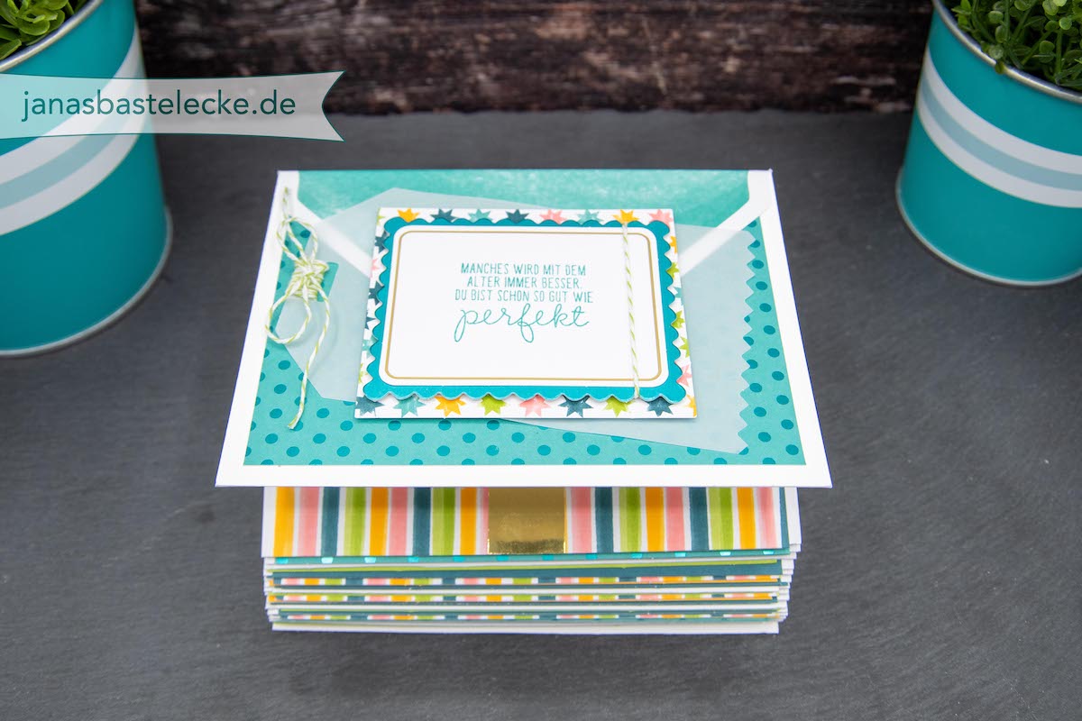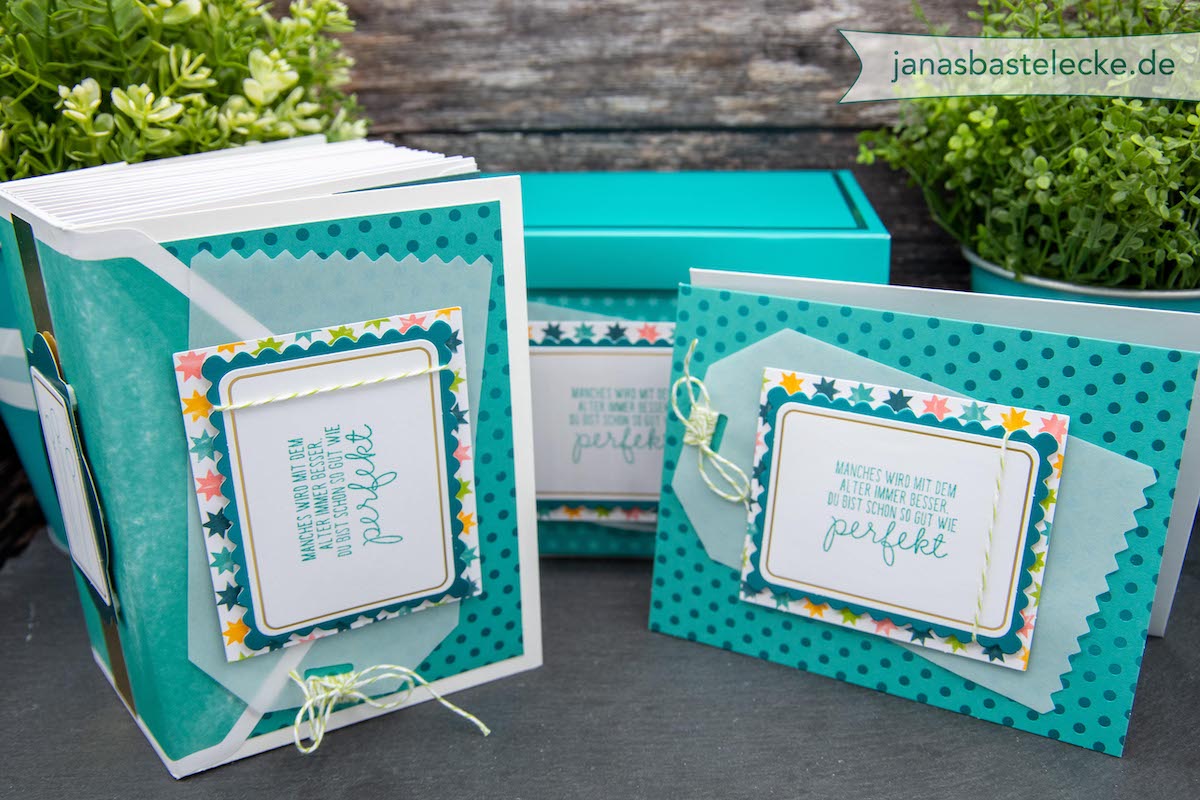 Ich hab daraus einfach ein Geburtstagsalbum gemacht, wo entweder Fotos vom Geburtstag reingeklebt werden können oder was man z. B. auch als Gästealbum verwenden kann, wenn man eine größere Feier macht. (Sobald das natürlich wieder möglich ist!) Das Album lässt sich wunderbar in der Box verstauen und so auch dekorativ ins Regal stellen. Passend dazu habe ich eine der Karten tatsächlich als Karte gestaltet.