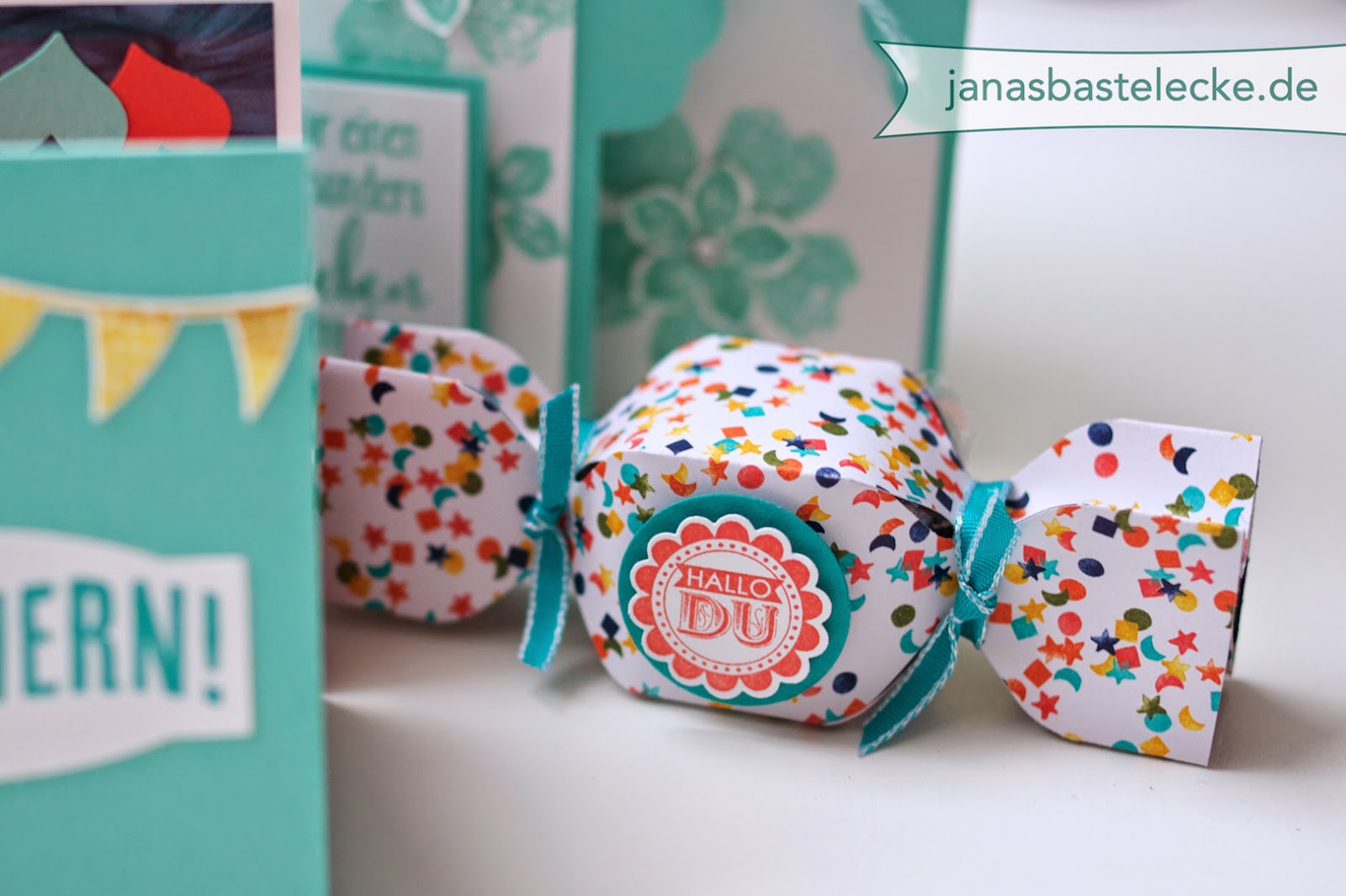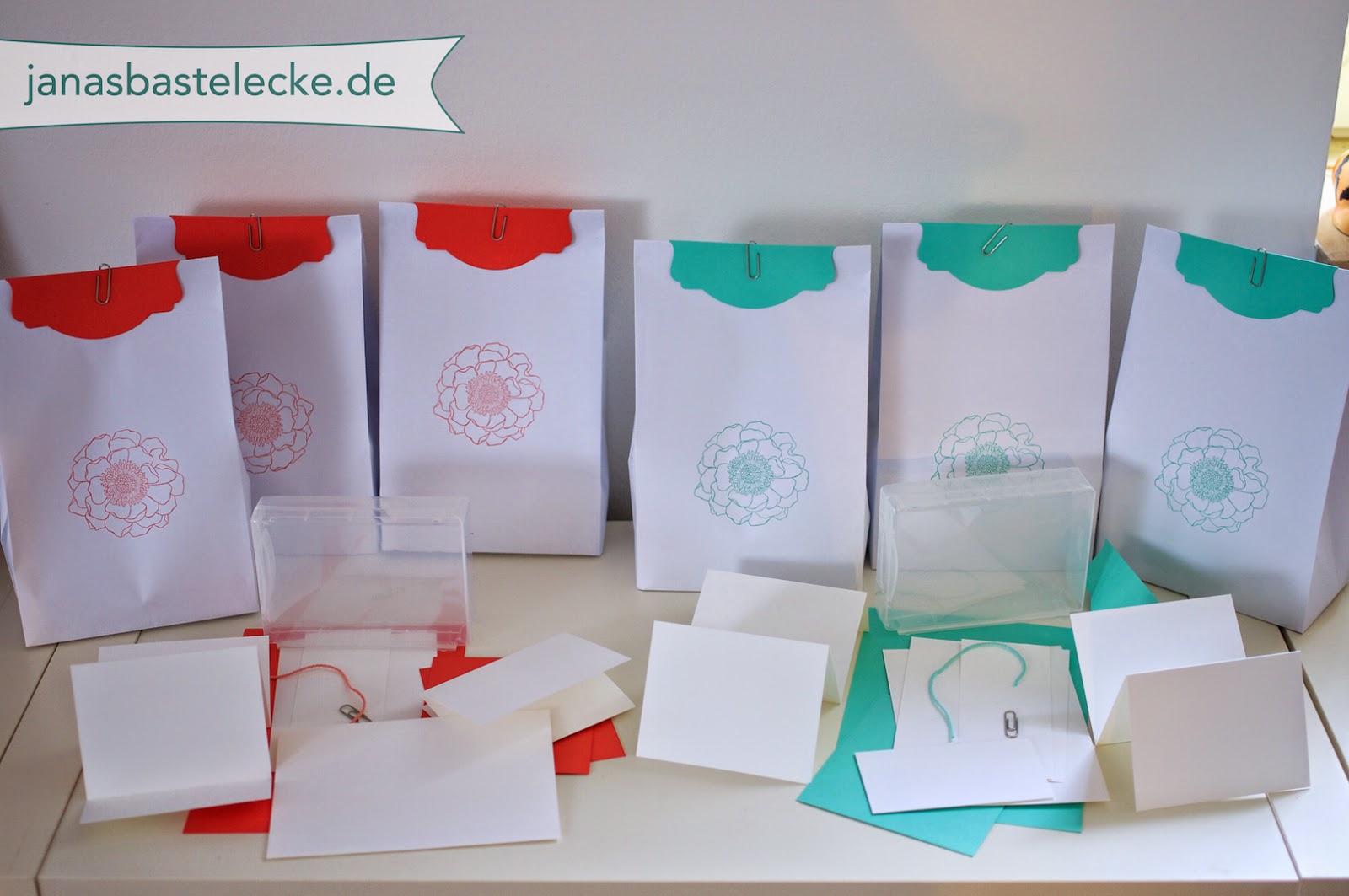 Dafür habe ich den Gästen und der Gastgeberin (insgesamt 6) Tütchen gepackt, die ich selbst aus DinA4 Umschlägen gemacht habe.